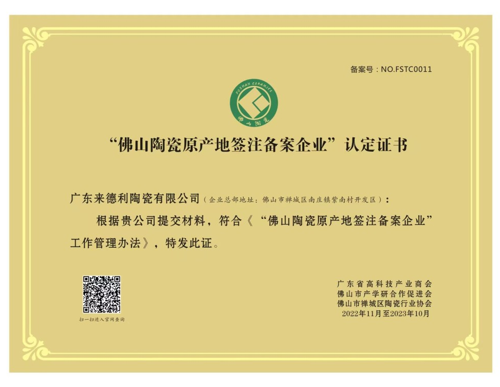一直以来,来德利陶瓷在绿色生产、降耗减污方面持续优化,助推消费新升级,于被授予“佛山陶瓷安全生产达标企业”、“2022佛山陶瓷共促消费公平承诺品牌”、“佛山陶瓷原产地签注备案企业”;6月凭借过硬的综合实力,荣获“陶瓷一线品牌”奖项!