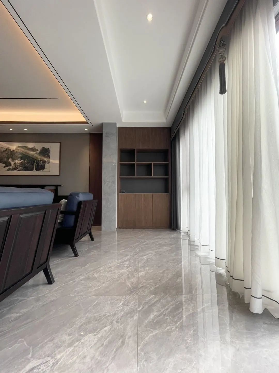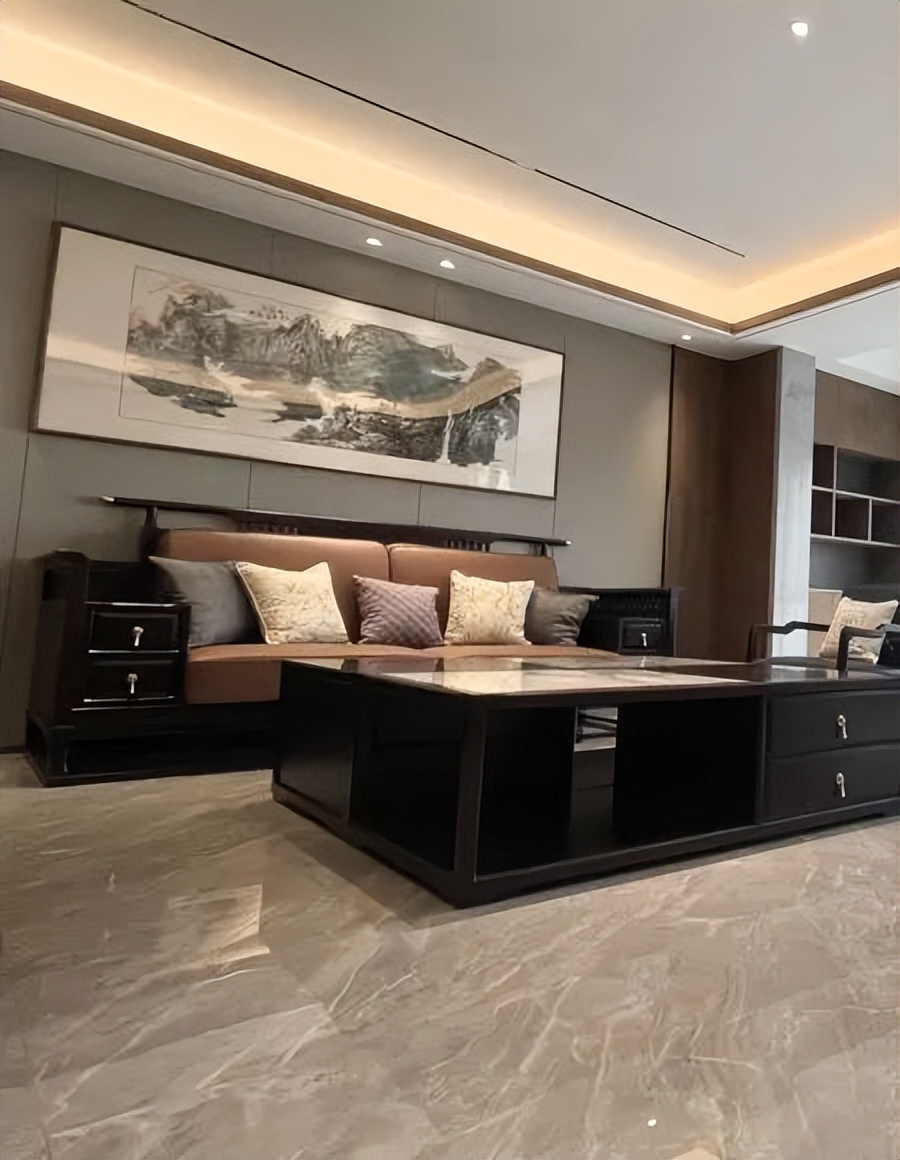 天花与墙面加入木条造型,让空间层次丰富又有意境。山水画的装饰画,为空间增添了禅意的气息,高级而优雅。