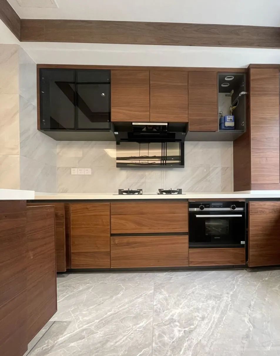 厨房宽敞明亮的空间, L形整体橱柜的设计,满足日常储物和放置,木制的纹理,显得高贵又典雅,既融合了传统中式的浓厚的质地感,同时又包含了现代风格的时尚,巧妙地结合在一起,反而会生发出一种精致感。