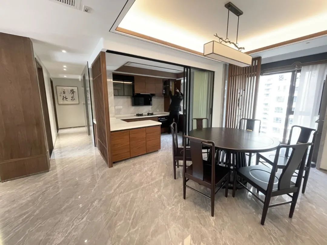 就餐区域与厨房相邻,这种布局方便快捷,避免距离过远耗费置餐的时间。安装移动门,有效地阻断了厨房仲油烟的溢散。