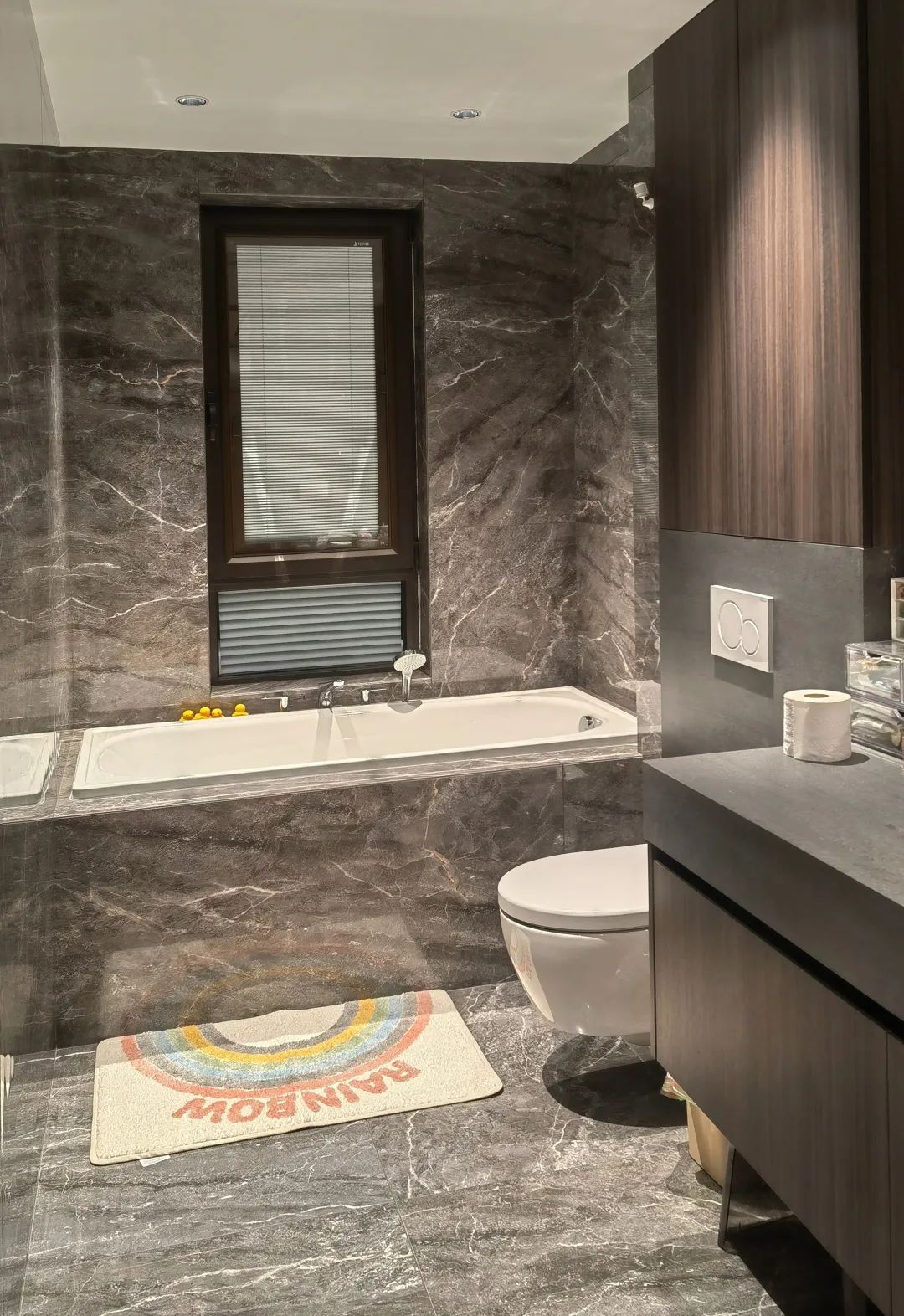 卫生间采用的是深灰调瓷砖墙地通铺